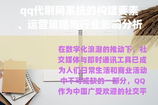 在数字化浪潮的推动下,社交媒体与即时通讯工具已成为人们日常生活和商业活动中不可或缺的一部分,QQ作为中国广受欢迎的社交平台,其生态系统中衍生出多种服务模式,其中qq代刷网系统作为一种技术辅助工具,在特定应用场景中逐渐崭露头角,本文将从技术架构、市场运作及行业效应等角度,系统性地探讨qq代刷网系统的相关要素,以提供全面的视角理解这一现象,通过分析其功能原理、运营方法及其在数字环境中的角色,我们能够更好地把握这一系统的发展脉络与潜在价值。
