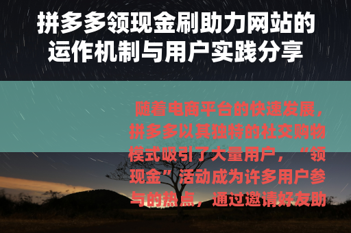 随着电商平台的快速发展,拼多多以其独特的社交购物模式吸引了大量用户。“领现金”活动成为许多用户参与的热点,通过邀请好友助力积累奖励,在这一背景下,刷助力网站逐渐兴起,为用户提供了一种互助式助力途径,这些网站通过集中用户资源,帮助参与者更高效地完成助力任务,从而领取现金奖励,本文将介绍这类网站的功能、使用方法及相关用户经验,为感兴趣者提供参考。