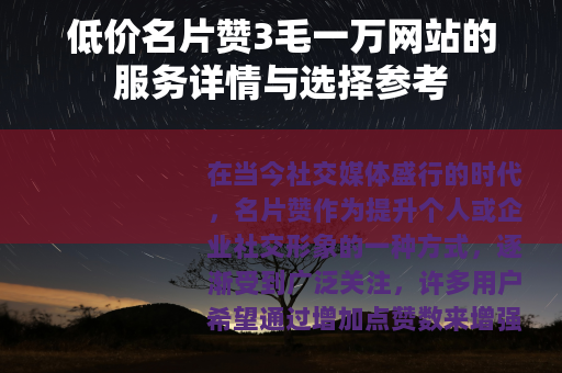在当今社交媒体盛行的时代,名片赞作为提升个人或企业社交形象的一种方式,逐渐受到广泛关注,许多用户希望通过增加点赞数来增强社交影响力,从而促进互动或业务推广,市场上出现了多种提供点赞服务的平台,低价名片赞3毛一万网站”成为热门选择之一,这类网站以低廉的价格提供大量点赞,例如每三万赞仅需几毛钱,吸引了众多用户的兴趣。