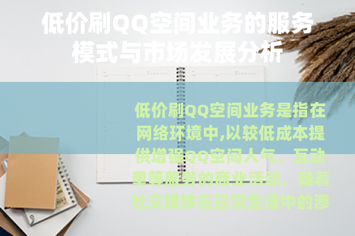 低价刷QQ空间业务是指在网络环境中,以较低成本提供增强QQ空间人气、互动量等服务的商业活动,随着社交媒体在日常生活中的渗透,许多用户希望提升个人或品牌在QQ空间中的可见度,从而推动了这类业务的兴起,这种服务通常涉及增加空间的浏览量、点赞数、评论或转发量,通过在线平台进行交易,满足不同用户的需求。