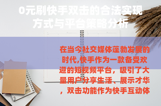 在当今社交媒体蓬勃发展的时代,快手作为一款备受欢迎的短视频平台,吸引了大量用户分享生活、展示才华,双击功能作为快手互动体系中的重要组成部分,代表着用户对内容的喜爱与支持,许多创作者希望提升视频的双击数量,以增强影响力和可见度,0元刷快手双击”成为常见话题,本文旨在探讨如何通过正当途径,在不花费金钱的情况下,增加快手双击,并分析其在实际应用中的效果。
