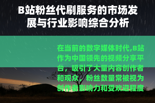 在当前的数字媒体时代,B站作为中国领先的视频分享平台,吸引了大量内容创作者和观众,粉丝数量常被视为创作者影响力和受欢迎程度的重要指标,一些服务提供商推出了“粉丝代刷”业务,旨在通过技术或人工方式,为B站用户快速增加粉丝数,这种现象在近年来逐渐兴起,引发了行业内的广泛讨论,本文将从多个角度分析B站粉丝代刷服务的现状、动因和市场效应,以期为读者提供一个全面的视角。