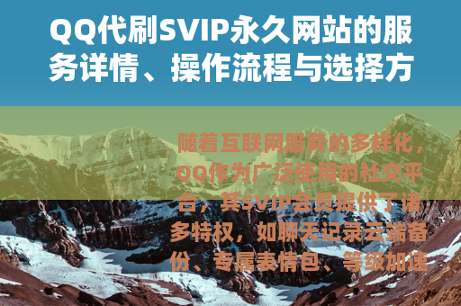 随着互联网服务的多样化,QQ作为广泛使用的社交平台,其SVIP会员提供了诸多特权,如聊天记录云端备份、专属表情包、等级加速等,为了满足用户对长期会员权益的需求,一些网站推出了QQ代刷SVIP永久的服务,帮助用户通过便捷方式获取会员资格,这类服务通常基于技术操作,旨在简化用户自行激活的复杂过程,让更多人享受SVIP的便利。