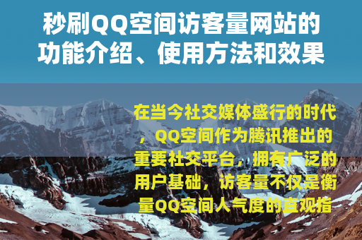 在当今社交媒体盛行的时代,QQ空间作为腾讯推出的重要社交平台,拥有广泛的用户基础,访客量不仅是衡量QQ空间人气度的直观指标,也反映了用户社交互动的影响力,许多用户寻求提升访客量的方法,其中秒刷QQ空间访客量的网站便成为一种常见选择,这类网站通过技术手段帮助用户快速增加访客数量,从而提升空间的可见性和关注度,本文将详细介绍这类网站的功能特点、运行原理、操作步骤以及实际效果,为用户提供全面的参考信息。