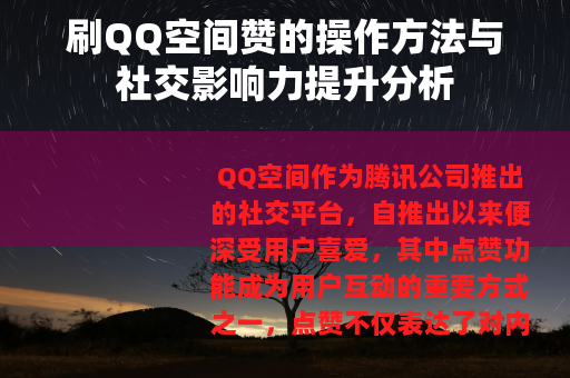 QQ空间作为腾讯公司推出的社交平台,自推出以来便深受用户喜爱,其中点赞功能成为用户互动的重要方式之一,点赞不仅表达了对内容的认可,还能增强社交联系,随着网络社交的普及,一些用户开始关注如何通过刷QQ空间赞来提升个人或内容的可见度,这种做法在特定群体中逐渐流行,但其背后涉及的技术和社交影响值得讨论。