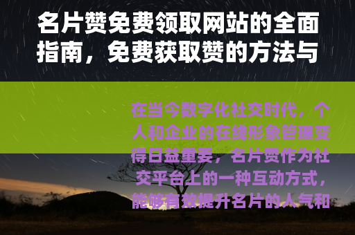 在当今数字化社交时代,个人和企业的在线形象管理变得日益重要,名片赞作为社交平台上的一种互动方式,能够有效提升名片的人气和可见度,从而增强社交影响力,为了帮助用户便捷地获得这些赞,许多免费领取网站应运而生,为用户提供了无需成本即可提升名片关注度的途径,本文将详细介绍名片赞免费领取网站的相关信息,包括其功能、使用方法、推荐资源以及使用建议,旨在为用户提供一份实用的参考指南。