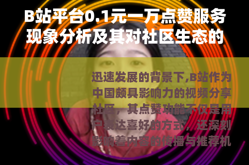 迅速发展的背景下,B站作为中国颇具影响力的视频分享社区,其点赞功能不仅是用户表达喜好的方式,还深刻影响着内容的传播与推荐机制,近年来,一些外部平台开始提供低价点赞服务,其中以“0.1元一万赞”为代表,这种服务在B站用户中逐渐引起关注,本文将从该服务的运作模式、对B站社区的可能影响以及相关应对措施等方面进行阐述。