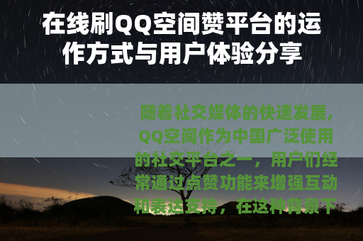 随着社交媒体的快速发展,QQ空间作为中国广泛使用的社交平台之一,用户们经常通过点赞功能来增强互动和表达支持,在这种背景下,在线刷QQ空间赞平台逐渐兴起,为用户提供了一种便捷的途径来增加点赞数量,这些平台通过技术手段,帮助用户快速提升点赞数,从而增强内容的可见度和社交影响力,本文将从平台的功能、工作原理、使用场景以及优势等方面进行介绍,以提供全面的了解。
