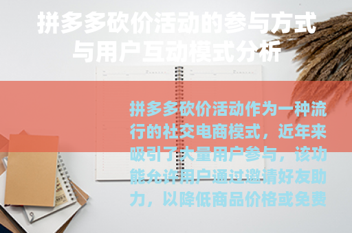 总体而言,拼多多砍价活动展现了电商与社交融合的一种实践形态,它通过价格激励促进用户自发传播,在提供消费优惠的同时,也创造了互动场景,对于普通用户而言,参与其中既可获取实惠,也能感受到社交协作的趣味性,随着数字消费模式的不断发展,此类融合社交元素的营销方式,或许将继续演化出更多样的形态。