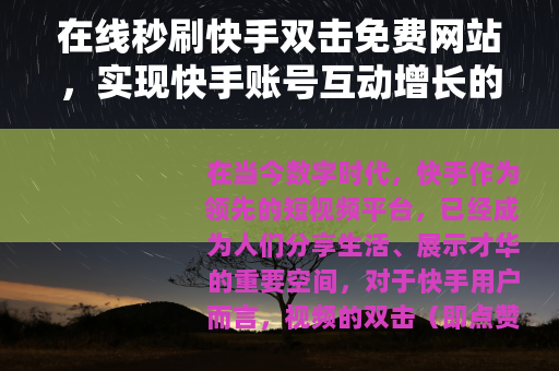 在当今数字时代,快手作为领先的短视频平台,已经成为人们分享生活、展示才华的重要空间,对于快手用户而言,视频的双击(即点赞)数量不仅反映了内容的受欢迎程度,更是推动视频传播、提升账号影响力的关键因素,随着用户对互动需求的增加,一种名为“在线秒刷快手双击网站免费”的服务逐渐兴起,它承诺通过免费、快速的方式帮助用户增加双击,从而优化账号表现,本文将详细介绍这类网站的功能、使用方法、潜在优势以及相关建议,旨在为用户提供实用指南,助力他们在快手平台上更有效地提升互动。