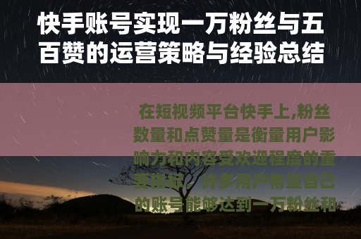 在短视频平台快手上,粉丝数量和点赞量是衡量用户影响力和内容受欢迎程度的重要指标,许多用户希望自己的账号能够达到一万粉丝和五百赞的里程碑,这不仅代表了个人创作能力的认可,也为后续发展奠定了基础,本文将分享一些实用的方法,帮助用户逐步实现这一目标。 是吸引粉丝和点赞的核心,在快手上,高质量的视频往往能获得更多关注,用户可以从自身兴趣或专长出发,创作独特、有趣或实用的内容,分享生活技巧、展示才艺表演或记录日常趣事,这些内容容易引发共鸣,保持内容风格的一致性,有助于树立个人品牌,让粉丝形成期待,注意视频的清晰度和剪辑效果,提升观看体验,这样能增加用户停留时间和互动意愿。