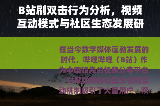 在当今数字媒体蓬勃发展的时代,哔哩哔哩(B站)作为中国领先的视频分享平台,以其独特的社区文化和互动机制吸引了大量用户,双击点赞功能是用户表达对视频内容认可的重要方式之一,近年来,一种称为“刷双击”的行为逐渐进入公众视野,即通过自动化或人工手段快速增加视频的双击点赞数量,这一现象不仅反映了用户对互动数据的关注,也引发了关于平台生态健康的讨论,本文将从多个角度分析刷双击行为的成因、表现及其对B站社区的影响,旨在提供一个全面的视角。