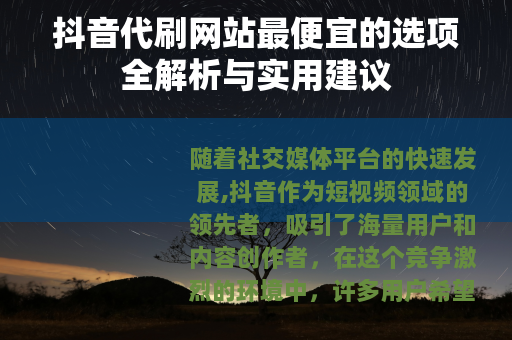 随着社交媒体平台的快速发展,抖音作为短视频领域的领先者,吸引了海量用户和内容创作者,在这个竞争激烈的环境中,许多用户希望通过代刷服务提升账号的粉丝数、点赞量和评论互动,以增强曝光度和影响力,对于预算有限的个人或小型创作者来说,找到最便宜的抖音代刷网站成为一项常见需求,本文将从多个角度解析抖音代刷网站的最便宜选项,并提供实用建议,帮助用户在成本控制的前提下做出合适选择。