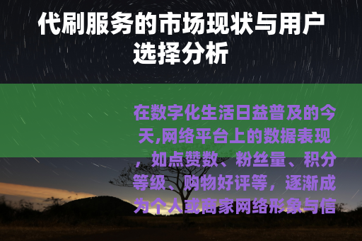 在数字化生活日益普及的今天,网络平台上的数据表现,如点赞数、粉丝量、积分等级、购物好评等,逐渐成为个人或商家网络形象与信誉的重要组成部分,随之而来,一种旨在快速提升这些数据指标的服务——代刷,悄然兴起并形成了一个特定的市场领域,本文将对这一现象进行梳理,分析其背后的需求逻辑、常见类型,并为用户提供相关选择的参考视角。