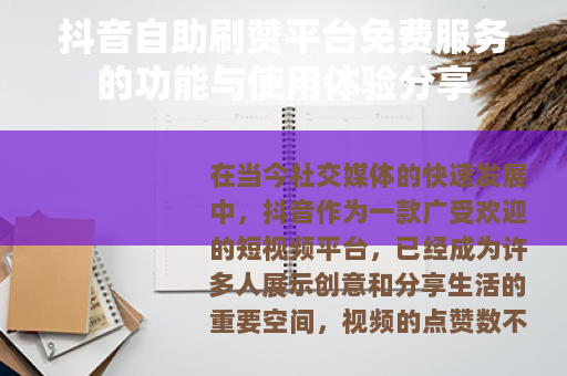 在当今社交媒体的快速发展中,抖音作为一款广受欢迎的短视频平台,已经成为许多人展示创意和分享生活的重要空间,视频的点赞数不仅象征着内容的受欢迎程度,还可能影响平台算法的推荐机制,从而决定内容的传播范围,为了快速提升点赞量,一些用户开始关注抖音自助刷赞平台免费服务,这些平台提供自动点赞功能,无需支付费用,成为不少创作者尝试的工具之一。