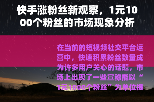 在当前的短视频社交平台运营中,快速积累粉丝数量成为许多用户关心的话题,市场上出现了一些宣称能以“1元1000个粉丝”为单位提供快手涨粉服务的渠道,这引起了广泛关注,此类服务通常以极低的单价和高效率作为宣传点,吸引了不少希望短期内提升账号粉丝量的用户。