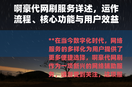 在当今数字化时代,网络服务的多样化为用户提供了更多便捷选择,啊豪代网刷作为一项新兴的网络辅助服务,逐渐受到关注,这项服务主要围绕代刷网络任务展开,旨在帮助用户高效完成特定在线操作,通过系统化的流程和专业技术,它为用户节省时间与精力,并提升网络活动的整体效率,本文将深入介绍啊豪代网刷的服务内容、操作方式、优势特点以及实际应用,以期为读者提供清晰的认知参考。