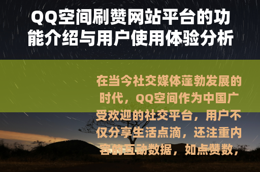 在当今社交媒体蓬勃发展的时代,QQ空间作为中国广受欢迎的社交平台,用户不仅分享生活点滴,还注重内容的互动数据,如点赞数,点赞数往往被视为社交影响力的指标之一,一些用户寻求快速提升点赞数的方法,qq空间刷赞网站平台便在这样的背景下出现,它们通过提供点赞增值服务,帮助用户在短时间内增加点赞量,这些平台通常以在线网站形式存在,用户通过简单操作即可获得服务,从而在社交圈中增强存在感,本文将从功能、使用体验和相关影响等方面,客观介绍这类平台。