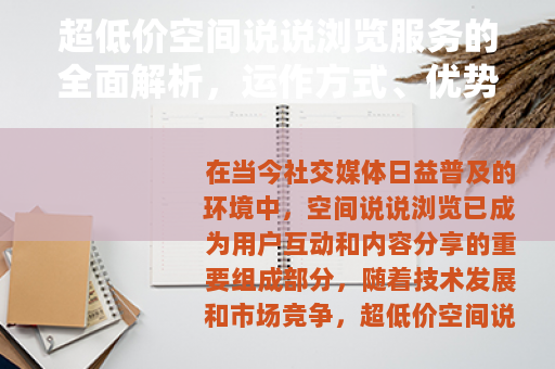在当今社交媒体日益普及的环境中,空间说说浏览已成为用户互动和内容分享的重要组成部分,随着技术发展和市场竞争,超低价空间说说浏览服务逐渐进入公众视野,为用户提供了一种经济高效的社交参与方式,本文将详细介绍这一服务的运作机制、核心优势以及实际应用场景,帮助读者更好地理解其价值和可行性。