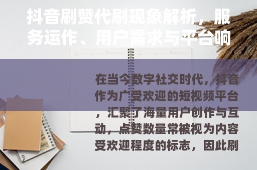 在当今数字社交时代,抖音作为广受欢迎的短视频平台,汇聚了海量用户创作与互动,点赞数量常被视为内容受欢迎程度的标志,因此刷赞代刷服务逐渐兴起,即通过外部手段为抖音视频增加点赞数的行为,这一现象反映了社交媒体生态中的某些趋势,本文将从服务运作、用户需求和平台响应等方面进行阐述。