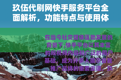 在当今社交媒体蓬勃发展的背景下,快手平台以其丰富的短视频内容和广泛的用户基础,成为许多人展示自我、推广品牌的重要渠道,玖伍代刷网作为专注于快手平台的服务网站,为用户提供了一系列增强账户表现的工具与支持,本文将从服务内容、操作流程和用户反馈等方面,介绍该平台的基本情况,帮助读者了解其运作方式。