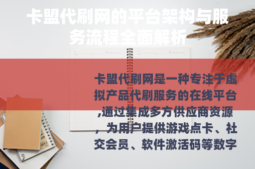 卡盟代刷网是一种专注于虚拟产品代刷服务的在线平台,通过集成多方供应商资源,为用户提供游戏点卡、社交会员、软件激活码等数字商品的快速充值与交付,在数字化时代,这类平台已成为消费者获取虚拟服务的重要渠道,以其便捷性和效率受到广泛关注。