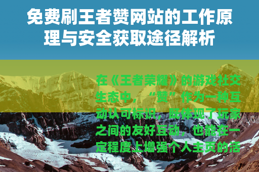 在《王者荣耀》的游戏社交生态中,“赞”作为一种互动认可标识,既体现了玩家之间的友好互动,也能在一定程度上增强个人主页的活跃度,部分玩家希望通过更便捷的方式获得点赞,从而出现了“免费刷王者赞网站”这类网络服务,这些平台通常通过技术手段或用户互助模式,为有需求的玩家提供点赞支持。
