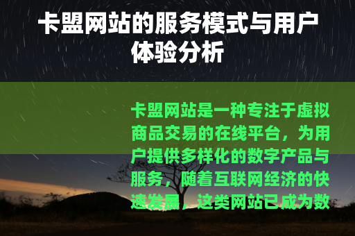 展望未来,卡盟网站可能会朝着更智能化和全球化的方向发展,技术进步将带来更快的交易速度和更强的安全防护,而跨境电子商务的兴起则可能拓宽商品来源,让用户享受到国际化的虚拟产品,与其他数字平台的合作,如社交媒体或内容创作者网络,可能为卡盟网站带来新的增长点,无论如何,其核心目标仍是提供便捷、可靠的虚拟商品服务,满足用户不断变化的需求。