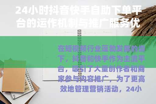 在短视频行业蓬勃发展的当下,抖音和快手作为主流平台,吸引了大量创作者和商家参与内容推广,为了更高效地管理营销活动,24小时抖音快手自助下单平台逐渐成为常用工具,为用户提供全天候的便捷服务,这类平台通过自动化系统,让用户能够自主选择并完成订单,如下单增加点赞、评论或分享等互动数据,从而提升短视频的曝光度。