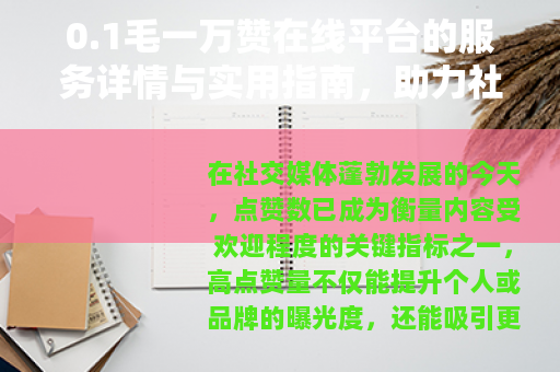 在社交媒体蓬勃发展的今天,点赞数已成为衡量内容受欢迎程度的关键指标之一,高点赞量不仅能提升个人或品牌的曝光度,还能吸引更多自然流量,增强网络影响力,为此,各种在线服务工具不断涌现,0.1毛一万赞在线平台”因其低成本和高效率的特点,受到广泛关注,这类平台以极实惠的价格提供点赞服务,帮助用户快速提升内容互动数据,本文将系统介绍该平台的服务内容、操作流程以及实际应用价值,为用户提供一份清晰的使用参考。