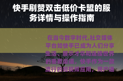 在当今数字时代,社交媒体平台如快手已成为人们分享生活、展示才华和连接世界的重要渠道,快手作为一款流行的短视频应用,用户通过发布内容来吸引关注,其中点赞和双击(即喜欢)等互动指标往往被视为内容受欢迎程度的体现,随着用户对提升社交影响力的需求增长,一些服务如刷赞双击应运而生,并结合低价卡盟模式,为用户提供了一种便捷的解决方案,本文将详细介绍快手刷赞双击低价卡盟的相关内容,帮助读者了解其运作方式、使用方法和市场现状,旨在以客观角度呈现信息,供参考之用。