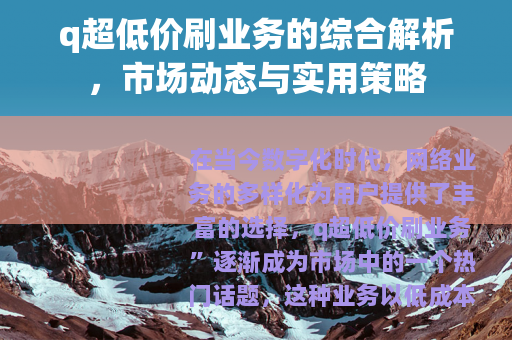 在当今数字化时代,网络业务的多样化为用户提供了丰富的选择,q超低价刷业务”逐渐成为市场中的一个热门话题,这种业务以低成本为核心特点,旨在通过技术手段帮助用户实现特定目标,如提升网络影响力、增强数据表现等,本文将从多个角度分析这一业务,包括其定义、市场现状、优势、应用场景、使用建议以及未来展望,为读者提供一个全面的了解。