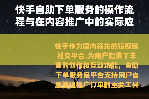 快手作为国内领先的短视频社交平台,为用户提供了丰富的创作和互动功能,自助下单服务是平台支持用户自主管理推广订单的重要工具,旨在提升使用效率和灵活性,本文将系统介绍快手自助下单功能的基本概念、操作步骤、优势特点及其在内容创作和营销中的具体应用,帮助用户更好地理解和利用这一服务。