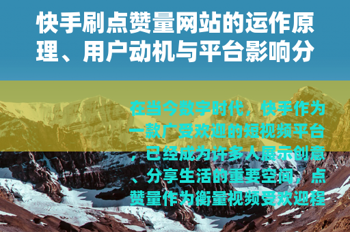 在当今数字时代,快手作为一款广受欢迎的短视频平台,已经成为许多人展示创意、分享生活的重要空间,点赞量作为衡量视频受欢迎程度的核心指标,不仅反映了内容的吸引力,还直接影响到用户的社交影响力和潜在商业机会,随着对点赞量需求的增长,一些提供点赞量增加服务的网站应运而生,通常被称为“快手刷点赞量网站”,这些网站通过特定方式帮助用户快速提升视频的点赞数,从而在平台上获得更多关注,本文将详细介绍这类网站的运作原理、用户使用动机以及对快手平台生态的潜在影响,旨在为读者提供一个全面的视角。
