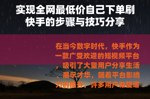 在当今数字时代,快手作为一款广受欢迎的短视频平台,吸引了大量用户分享生活、展示才华,随着平台影响力的提升,许多用户希望增强自己的曝光度,其中刷快手(如增加粉丝、点赞或评论)成为一种常见方式,自己下单刷快手不仅能更好地控制成本,还能实现个性化需求,本文将详细介绍如何以全网最低价自己下单刷快手,涵盖方法、步骤和相关建议,帮助用户在合理范围内优化体验。