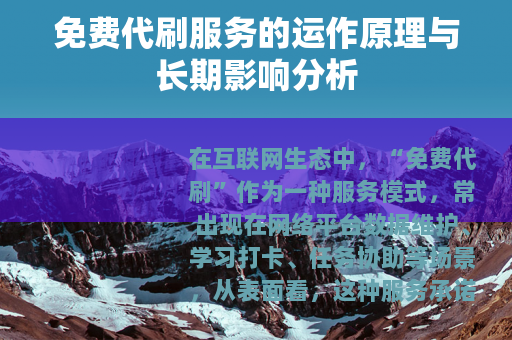 在互联网生态中,“免费代刷”作为一种服务模式,常出现在网络平台数据维护、学习打卡、任务协助等场景,从表面看,这种服务承诺以零成本帮助用户完成重复性、耗时性或需一定技术门槛的操作,例如社交账号互动量提升、课程进度自动完成、游戏任务代处理等,其存在反映了部分网络活动存在的机械性需求,以及用户对效率提升的普遍期待。