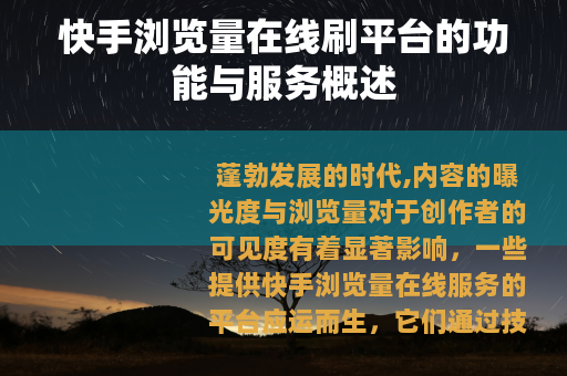 蓬勃发展的时代,内容的曝光度与浏览量对于创作者的可见度有着显著影响,一些提供快手浏览量在线服务的平台应运而生,它们通过技术方式,为有需要的用户提供了一种提升作品数据表现的渠道。