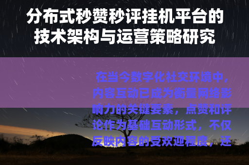 在当今数字化社交环境中,内容互动已成为衡量网络影响力的关键要素,点赞和评论作为基础互动形式,不仅反映内容的受欢迎程度,还直接推动其传播范围,为了应对高效率互动的需求,分布式秒赞秒评挂机平台应运而生,这类平台通过技术集成,实现自动化的点赞和评论操作,为用户提供便捷服务,本文将系统阐述该平台的技术原理、应用场景、优势特点及发展前景,以客观视角分析其业务价值。
