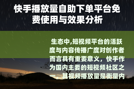 生态中,短视频平台的活跃度与内容传播广度对创作者而言具有重要意义,快手作为国内主要的短视频社区之一,其视频播放量是衡量内容受欢迎程度和影响范围的直观指标之一,在此背景下,一些提供快手播放量自助下单服务的平台应运而生,其中部分平台设有免费体验或初始服务,本文将就这类平台的基本功能、使用方式以及相关影响进行阐述,旨在为内容创作者提供一份参考信息。