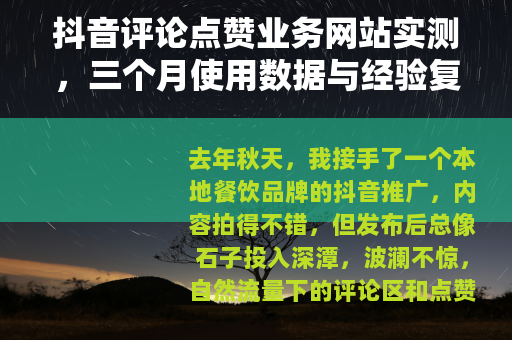 去年秋天,我接手了一个本地餐饮品牌的抖音推广,内容拍得不错,但发布后总像石子投入深潭,波澜不惊,自然流量下的评论区和点赞数,干净得让人心慌,团队里一个实习生悄悄问我:“要不要试试外面那些能做点赞评论的网站?” 我当时的反应和大多数人一样:听说过,觉得有点灰色,但具体怎么操作、效果如何、划不划算,心里完全没谱,出于实在没办法,也是好奇,我决定自己掏点钱,当一回“小白鼠”,这三个月,我前后用了四家不同的网站,花了大约七千块钱,买了差不多两百条评论和四万多个点赞,不是什么大型研究,就是一点真实的用户记录,写下来给大家当个参考。