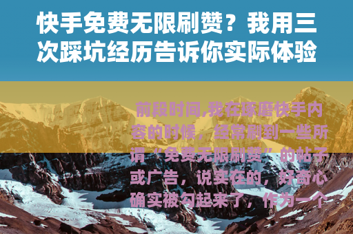 前段时间,我在琢磨快手内容的时候,经常刷到一些所谓“免费无限刷赞”的帖子或广告,说实在的,好奇心确实被勾起来了,作为一个普通用户,谁不希望自己的视频互动数据好看点呢?我花了差不多两周,陆陆续续试了网上流传的几种方法,结果嘛,跟我想的完全不一样,今天就跟大家随便聊聊这段经历,具体的数据和案例我都会提到。