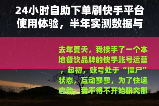 去年夏天,我接手了一个本地餐饮品牌的快手账号运营,起初,账号处于“僵尸”状态,互动寥寥,为了快速启动,我不得不开始研究那些能“即时补充数据”的途径。“24小时自助下单”这个领域进入了我的视野,这不是一篇指南,更不是吹捧,只是一个真实用户长达半年的折腾记录,一些数字,几个具体案例,还有不少尴尬的教训。