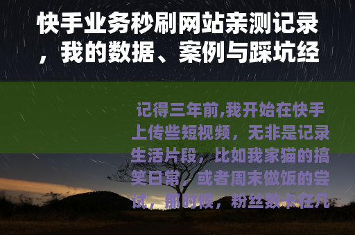 记得三年前,我开始在快手上传些短视频,无非是记录生活片段,比如我家猫的搞笑日常,或者周末做饭的尝试,那时候,粉丝数卡在几百上下,播放量也平平,偶尔有个视频小爆一下,但多数时候就像石沉大海,后来,听圈子里的朋友提起“快手业务秒刷网站”,说是能快速给视频加热度,提升粉丝和播放量,我当时半信半疑,但看着别人数据蹭蹭涨,心里痒痒的,就决定试试水,没想到,这一试就是一段折腾又长见识的路,我就把这些年的使用心得摊开来聊聊,全是个人经历,有数字、有案例,也踩过不少坑,希望能给类似情况的朋友一点参考。