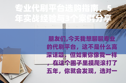 朋友们,今天我想聊聊专业的代刷平台,这不是什么高深话题,但如果你像我一样,在这个圈子里摸爬滚打了五年,你就会发现,选对一个平台能省下不少时间和金钱,而选错了,那简直就是一场噩梦,我在这五年里,用过超过二十个代刷平台,从刷社交媒体粉丝到电商销量,从游戏代练到数据优化,几乎都试了个遍,我就以一个普通用户的角度,分享一些数字、真实案例,还有我踩过的那些坑,文章可能会有点长,但我会尽量说得自然点,就像朋友间聊天一样,希望能给你带来点实用的东西。