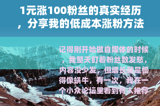 记得刚开始做自媒体的时候,我整天盯着粉丝数发愁,内容没少发,但增长就是慢得像蜗牛,有一次,我在一个小众论坛里看到有人推荐“1元涨100粉丝”的服务,当时心里咯噔一下:这么便宜,会不会是骗人的?但转念一想,1元钱就算打了水漂也不疼,索性试试看,没想到,这次尝试打开了一扇新世界的大门,也让我踩了不少坑,我就把这些年的经验揉碎了讲给你听,没有那些虚头巴脑的理论,只有实实在在的数字、案例和走过的弯路。
