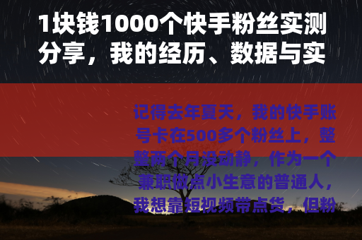 记得去年夏天,我的快手账号卡在500多个粉丝上,整整两个月没动静,作为一个兼职做点小生意的普通人,我想靠短视频带点货,但粉丝数老是上不去,心里挺急的,那时候,我在一个社交媒体群里看到有人打广告:“1块钱1000个快手粉丝,快速涨粉,限时优惠!” 当时第一反应是:这也太便宜了吧?毕竟平时听别人说,买粉丝少说也得几十块一百个,好奇心加上一点侥幸心理,我决定试试看——反正就一块钱,亏了也不心疼,没想到,这一试还真折腾出不少事儿,今天就跟大家唠唠这段经历,配上具体数字和案例,希望能帮到有类似想法的人。
