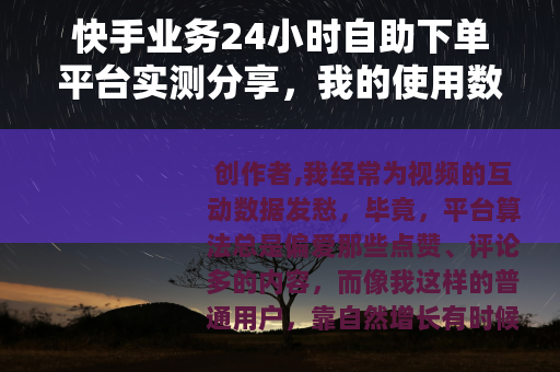 创作者,我经常为视频的互动数据发愁,毕竟,平台算法总是偏爱那些点赞、评论多的内容,而像我这样的普通用户,靠自然增长有时候真的慢得让人没脾气,后来,我听说了有一种24小时自助下单平台,专门提供快手业务的快捷服务,比如点赞、评论、分享什么的,一开始我还半信半疑,但用了几个月后,觉得这东西挺有意思的,今天就来聊聊我的真实体验,我会用具体数字、实际案例,还有我自己踩过的坑来展开,内容可能有点随意,但保证都是干货。