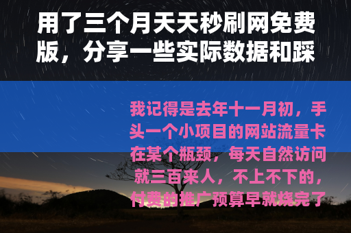 我记得是去年十一月初,手头一个小项目的网站流量卡在某个瓶颈,每天自然访问就三百来人,不上不下的,付费的推广预算早就烧完了,抱着“试试看又不花钱”的心态,在搜索引擎里胡乱组合关键词,撞到了这个叫“天天秒刷”的网站,斗大的“免费”俩字确实晃眼,当时心里门儿清,这类工具大概率有限制,但架不住好奇,心想就当是个实验,记录一下过程,万一有点用呢,这三个月,与其说是在用它做推广,不如说是在观察一个免费工具到底能把我带到哪儿,过程中攒下不少数字、几个挺有意思的小案例,还有几个当时让我挠头的坑,今天就跟大伙儿聊聊,完全是一个普通用户的角度,没什么宏大叙事,就是一段经历。