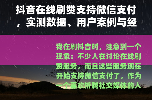 抖音在线刷赞支持微信支付,反映了网络服务的便利化趋势,如果你打算尝试,不妨从小额开始,多比较不同平台,并关注账号的整体健康,数据只是表面,真实互动和内容创造力才是持久动力,我的经历可能只是冰山一角,但希望这些分享能帮你少走点弯路。
