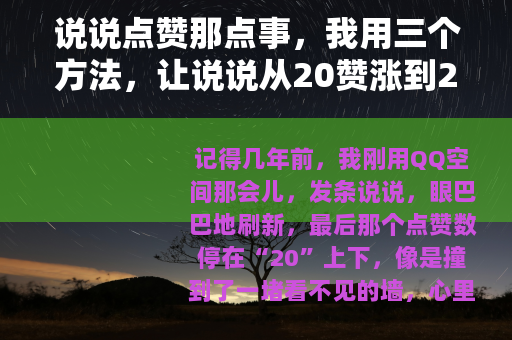 记得几年前,我刚用QQ空间那会儿,发条说说,眼巴巴地刷新,最后那个点赞数停在“20”上下,像是撞到了一堵看不见的墙,心里挺不是滋味,感觉像是对着空房间讲话,我琢磨着,这不应该啊,好友也有好几百呢,后来我花了差不多一年时间,折腾了不少法子,也踩了一堆坑,才算慢慢摸到点门道,今天没啥章法,就随便聊聊,你当听个故事也行。